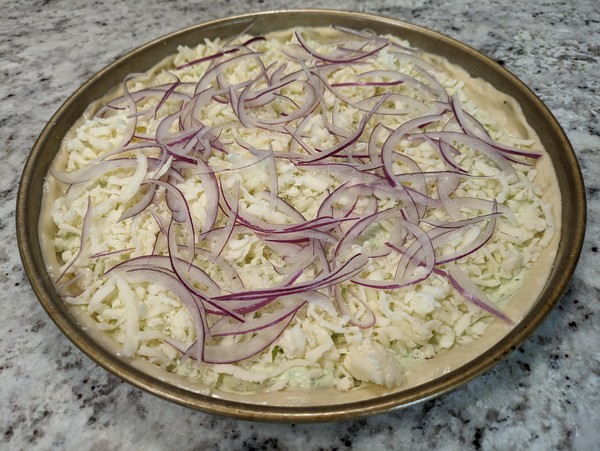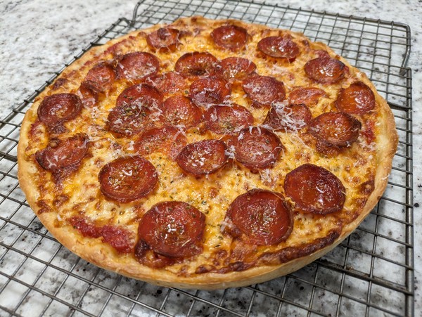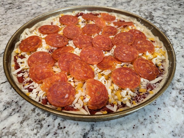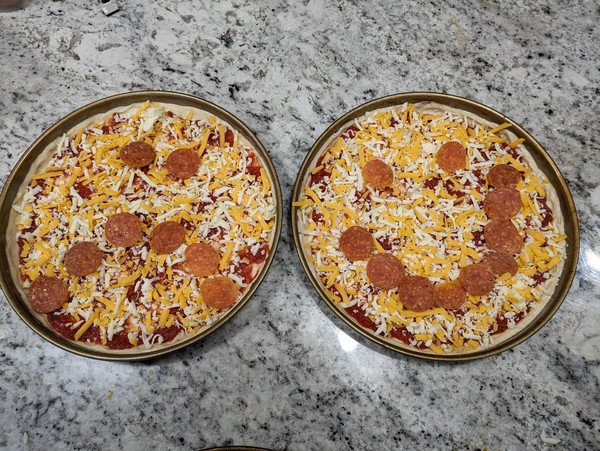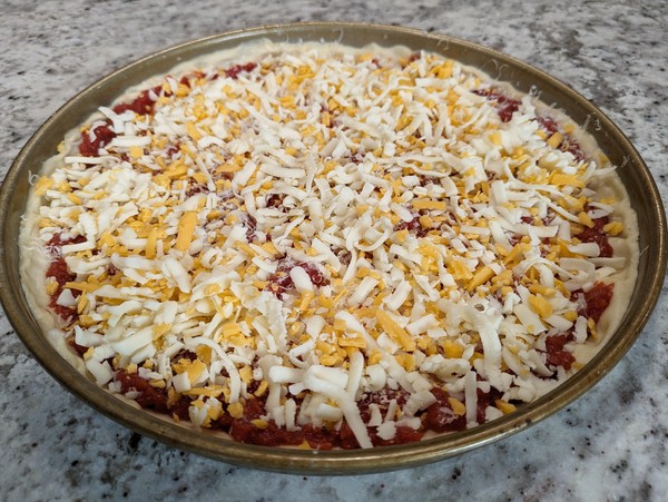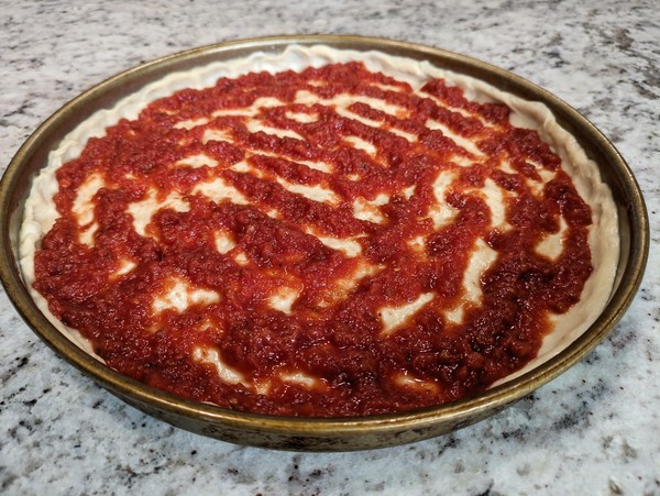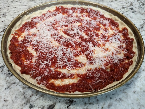 - Dimple and Dress => with greased fingers, dimple the dough by making a claw shape and then pressing down in columns up and down the pan. This helps prevent big air bubbles that screw up the bake. Pour 1/3 - 1/2 cup sauce into middle and spread to edges; it’s easiest with one hand spreading the sauce while the other spins the pan. Add layer of grated pecorino romano or parmesan reggiano, followed by relatively-light layer of cheese. You should be able to see the red sauce throughout. Top with pepperoni or whatever