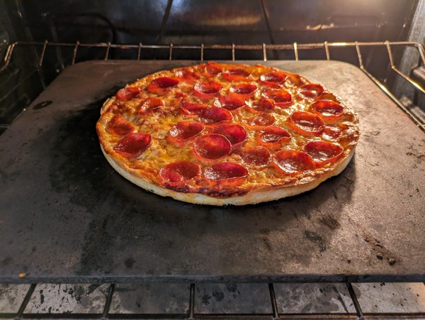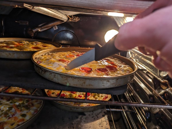 - Bake (~12-18 min) => Drop oven to 500°F and move pans to the stones or steels. Set timer for 5 minutes. Keep an eye out for any air bubbles and eliminate them with a steak knife. When the timer goes off, rotate the pans 180 degrees if the don’t fit on the steel or stone. White or lightly-topped pizzas may be done around the 10 minute mark. Heavily-sauced or topped ones will need 5 more minutes. When the tops look done, remove pans from oven and use spatula to peek at the the bottom. It should have some color. Slide onto peel and launch directly onto steel or stone. The goal is to get the bottom golden-brown and crispy, which may take a minute or three