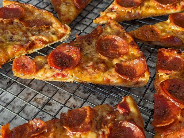 - Laced Edges => this refers to the burnt sauce and cheese that form on the edges since there’s no crust. Personal preference. I think the crust keeps things more intact and less messy to eat