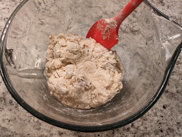 - In medium bowl, use a spatula to mix water with salt, yeast (let it sit a minute first), and oil. The oil won’t mix well, don’t worry about it. Add flour and use spatula to combine. Switch between moving wet to dry and scraping the sides, until it’s starting to come together