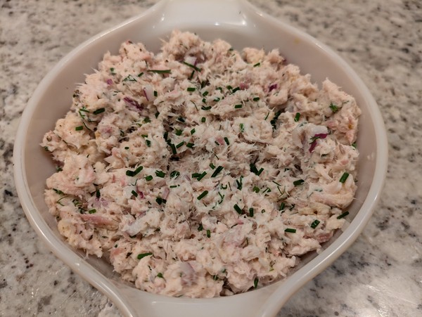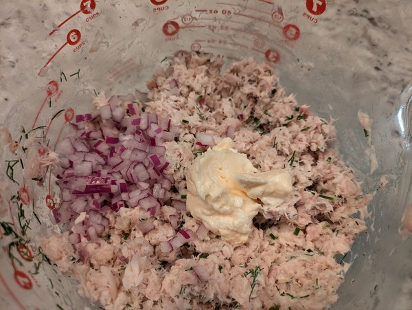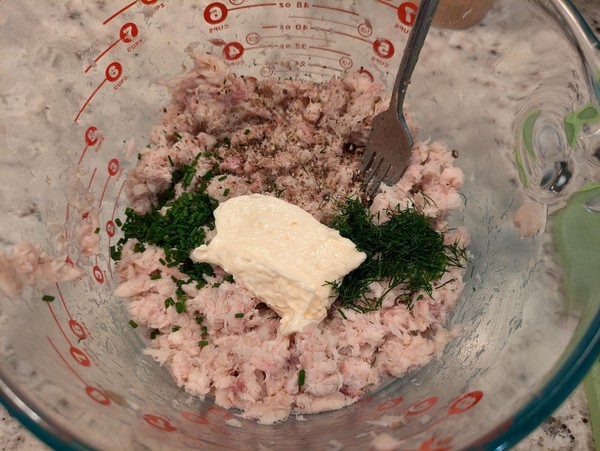 - Add the rest and mix => add red onion, fresh herbs, and a spoonful of mayo. Mix with spoon until combined, then see if it needs another spoonful or two of mayo. As a bagel topping, I’d go lighter on the mayo, and not over-mix. As a dip with crackers, I’d add more mayo and/or olive oil, black pepper, maybe cayenne powder or Tabasco, and mix on the smoother side.